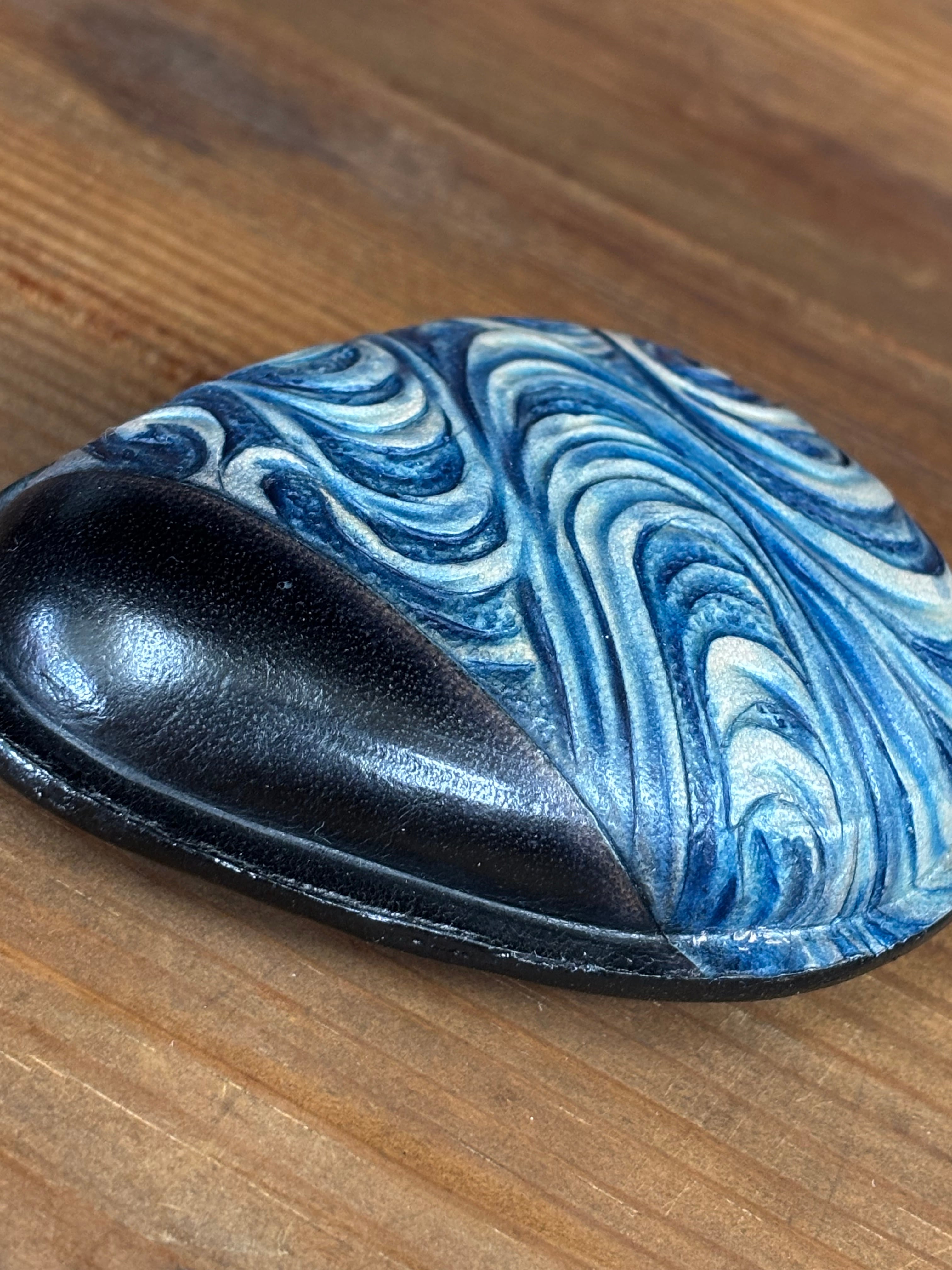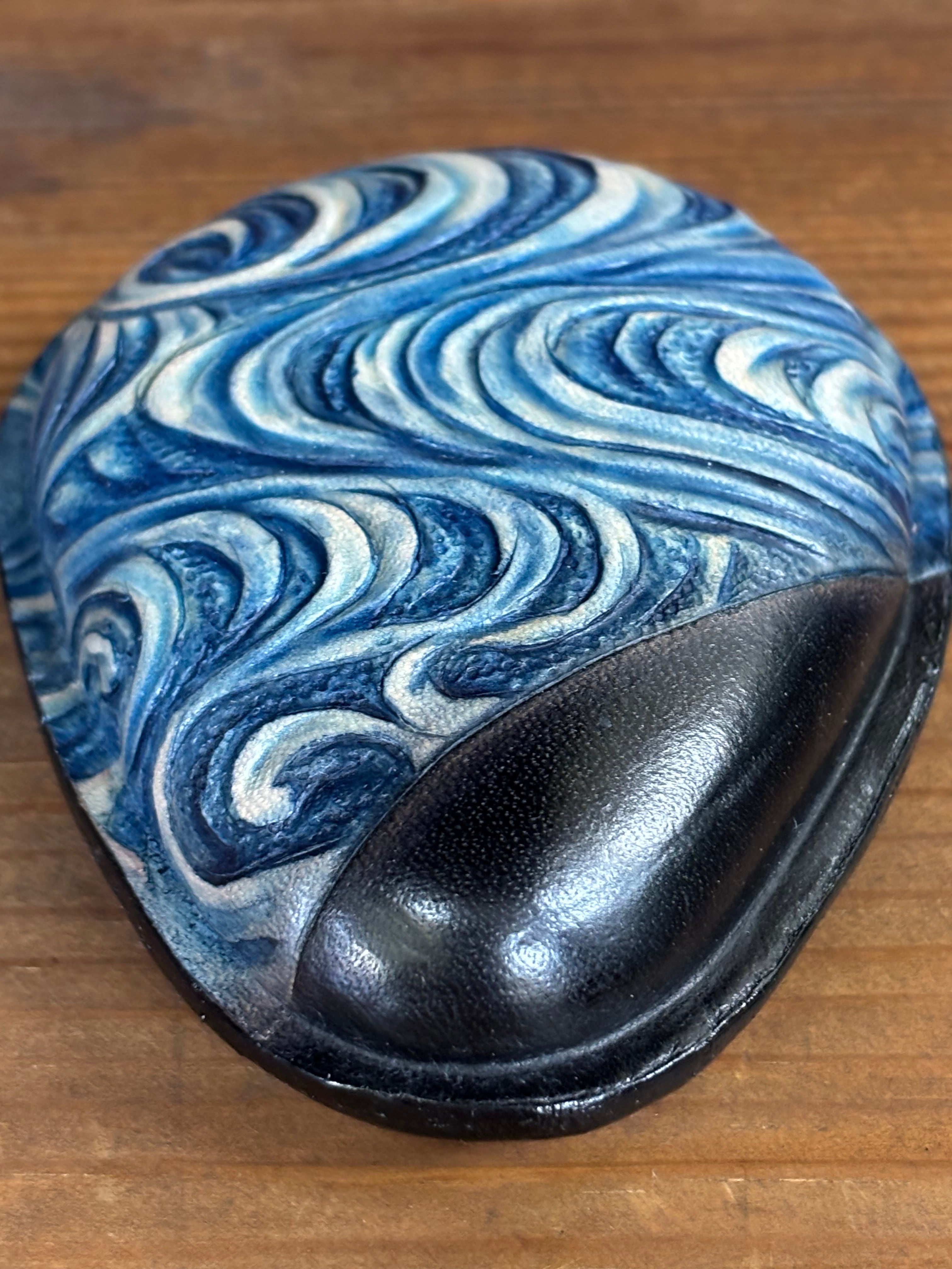 天然石を丁寧に皮で巻き込んで仕上げています。石本来の質感を活かし、手に馴染む重さが安定感をもたらします。日常の中で、その美しいデザインとともにお手元を彩ります。